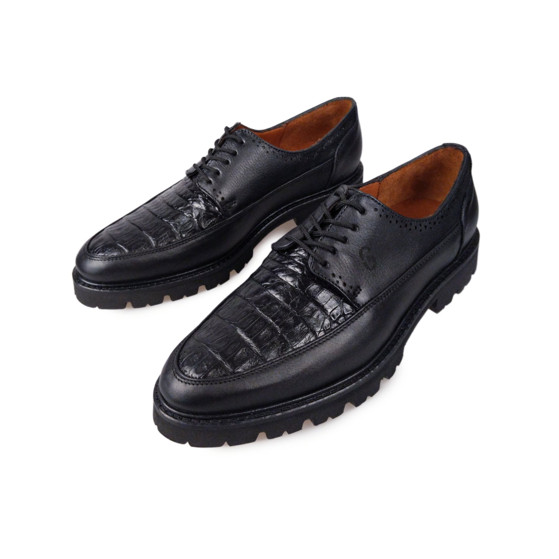 Redescubre los clásicos con una nueva textura exótica. Inspirado en la silueta Derby tradicional, este modelo eleva el legado de la colección Milán con piel de cocodrilo genuina en tono negro profundo. Cada escama cuenta una historia que convierte tu par en un estilo único.