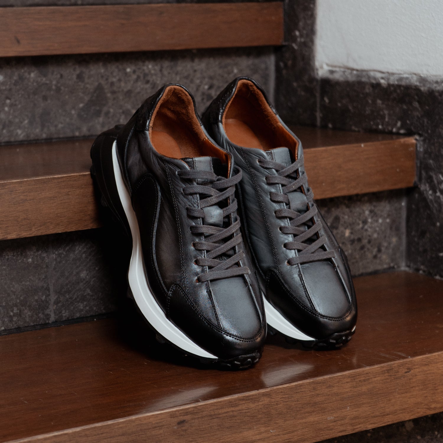 Mureno Slate es un calzado que lleva la estética al terreno de lo esencial. Su exterior en tonos negro y gris evoca la textura de la pizarra en su forma más pura. Cada par está confeccionado a mano con piel de res seleccionada por su resistencia y suavidad al tacto, trabajada cuidadosamente para lograr un sombreado único que resalta los matices naturales del material.