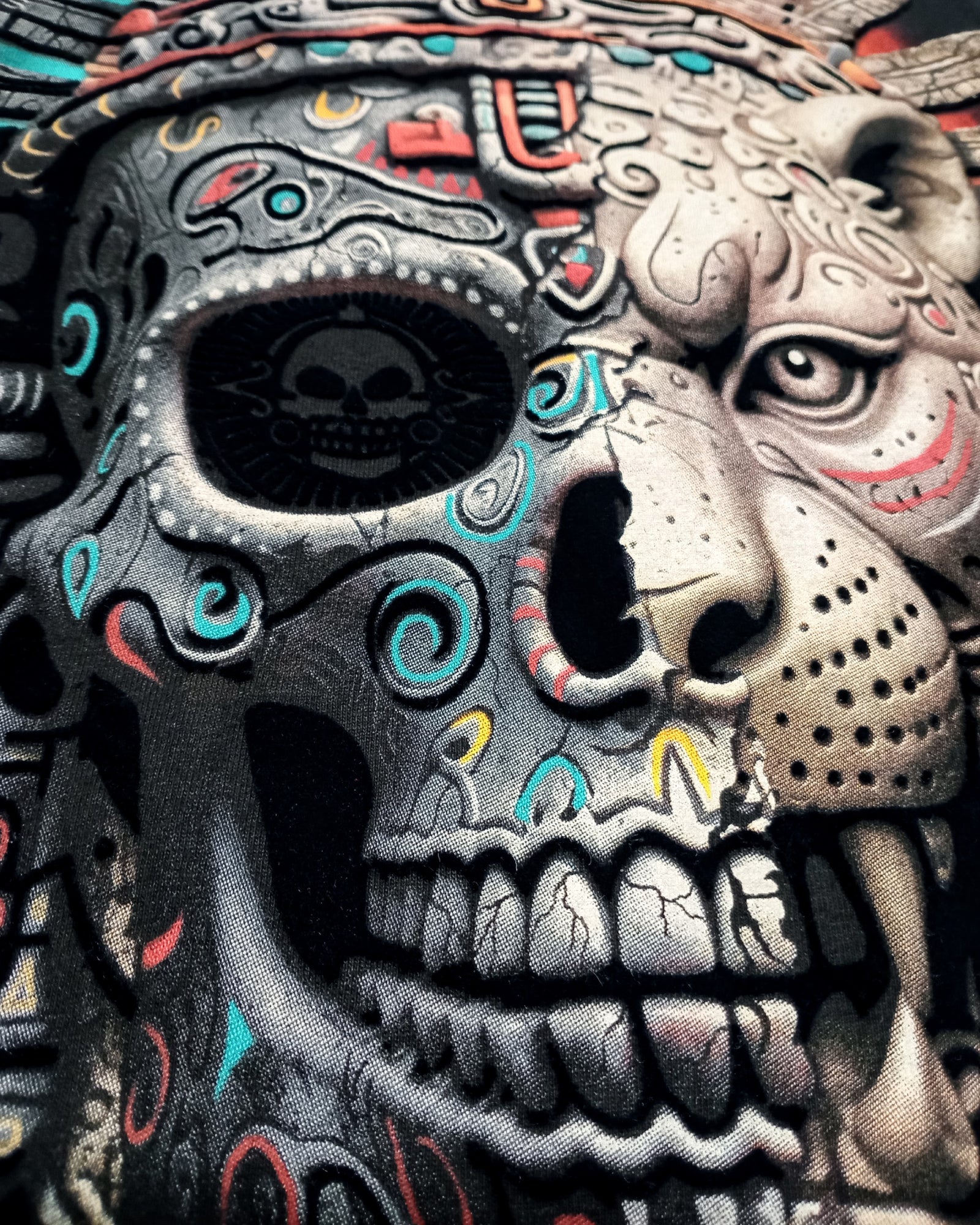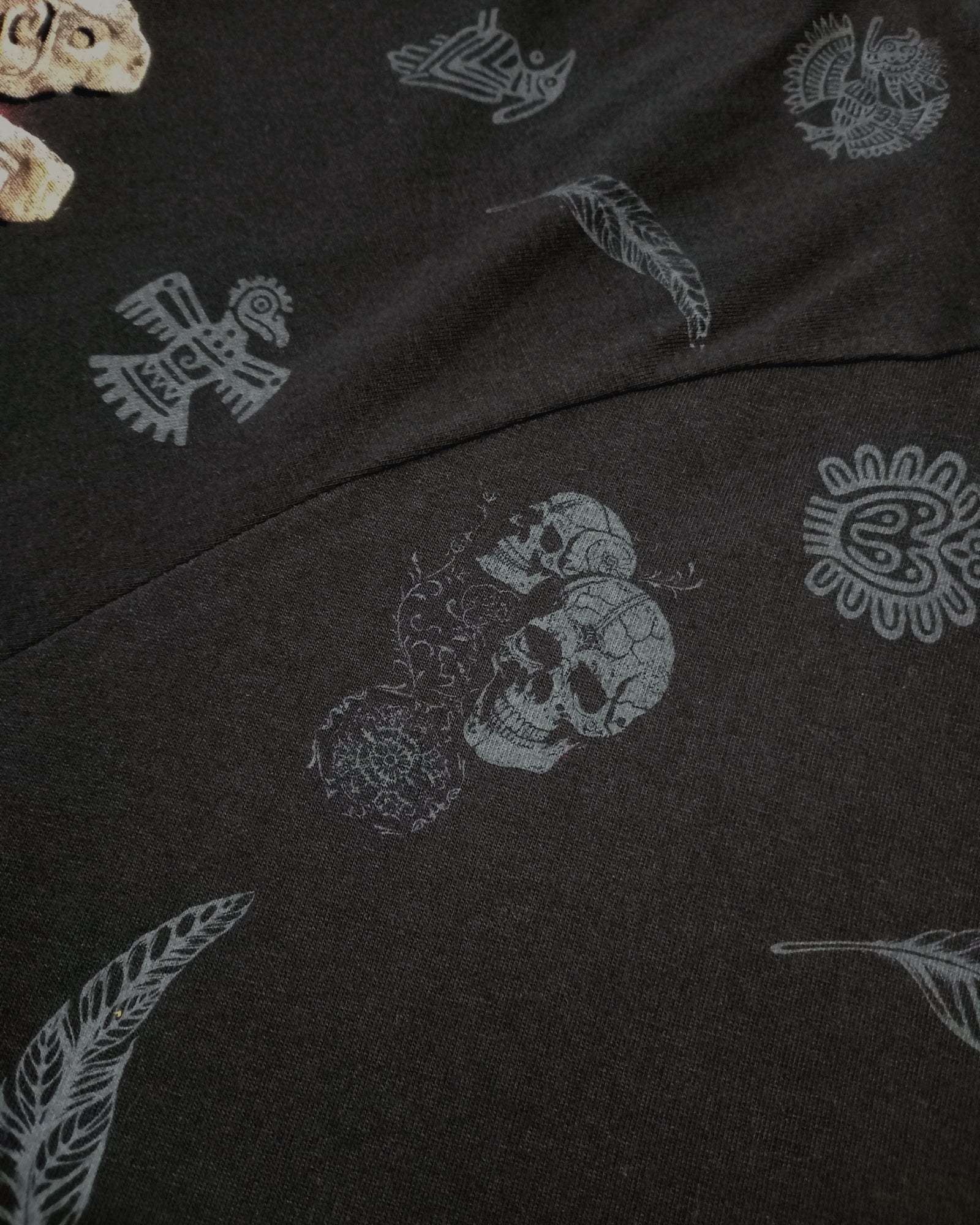 Diseño Trasero Riqueza Cultural: Un gran gráfico en la espalda que combina un majestuoso Jaguar, junto a detalles de calaveras, plumas, y grecas ancestrales que evocan la cosmovisión de la cultura.