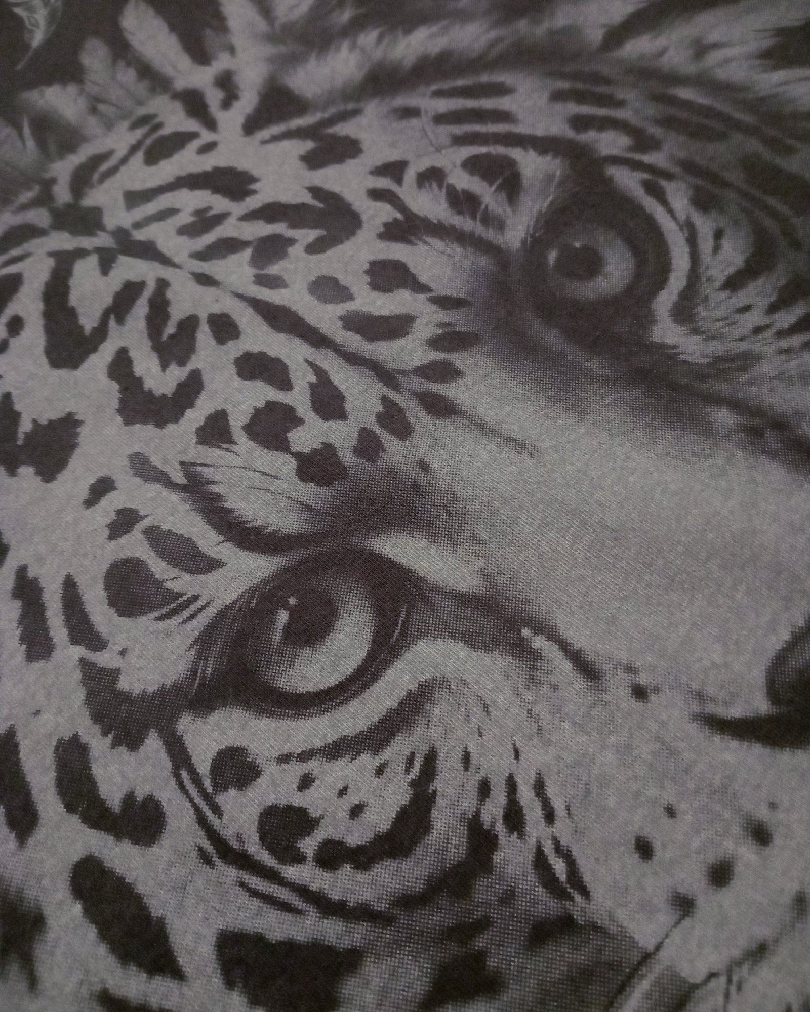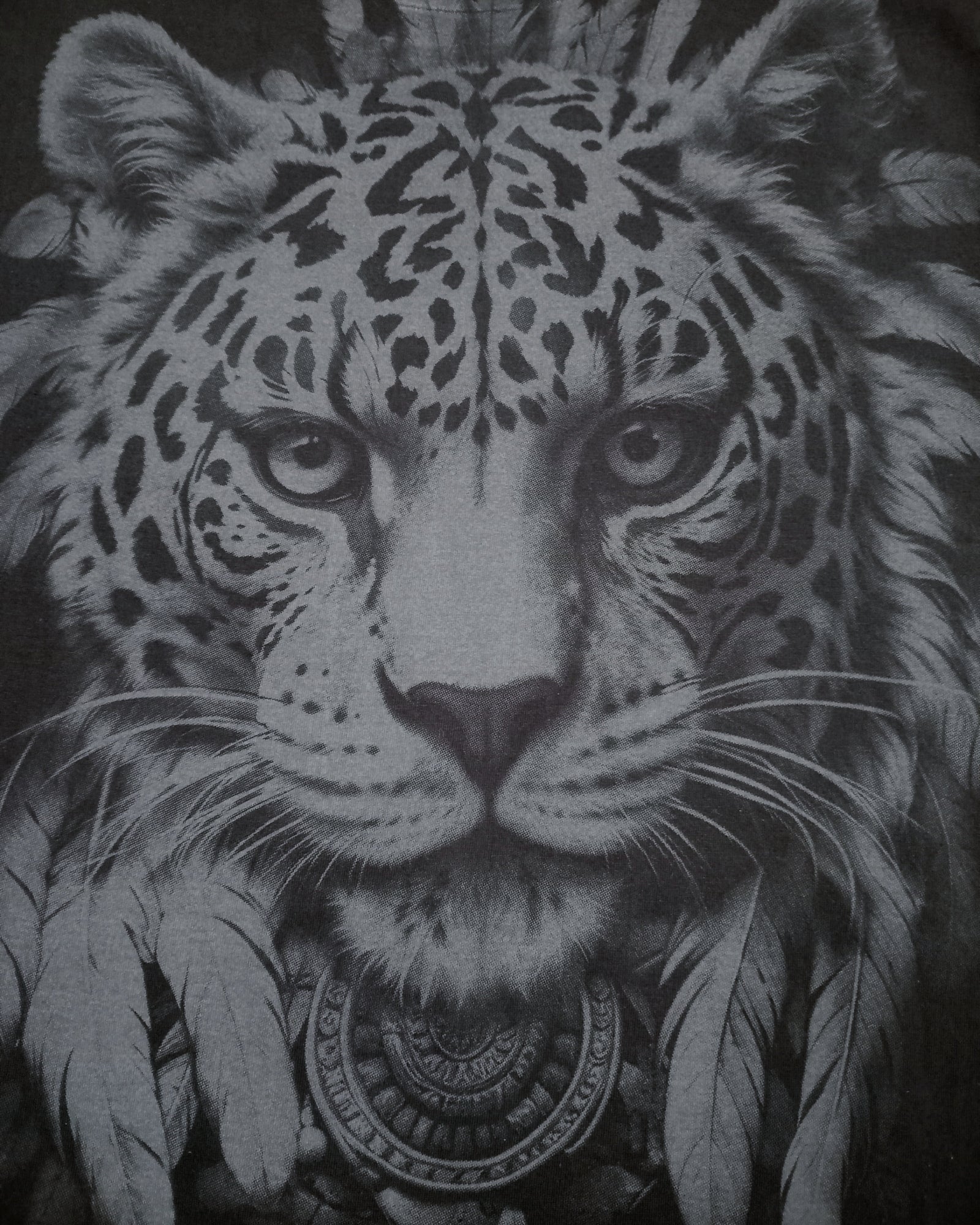 Arte Frontal Impactante: Estampado detallado de un Guerrero Jaguar con textura de piedra, simbolizando poder y valentía.